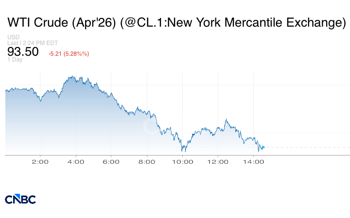 بينما انخفضت العقود الآجلة لخام غرب تكساس الوسيط الأميركي، 5.21 دولار أو 5.28% لتبلغ عند التسوية 93.50 دولار للبرميل.