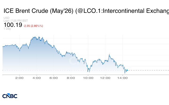 تراجعت العقود الآجلة لخام برنت القياسي العالمي، تسليم مايو، بنسبة 2.86% لتصل عند التسوية إلى 100.19 دولاراً للبرميل، متراجعةً عن مكاسبها السابقة.