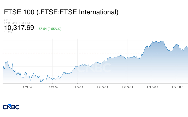 في حين كسب مؤشر فوتسي البريطاني بنسبة 0.55% مرتفعاً إلى 10,317.69 نقطة.