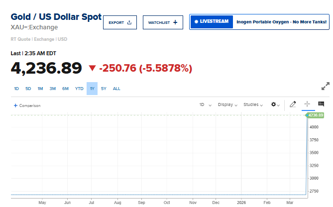 وهبط الذهب في المعاملات الفورية بنسبة 5.5% إلى 4236.89 دولار للأونصة، مسجلاً تراجعاً للجلسة التاسعة على التوالي.