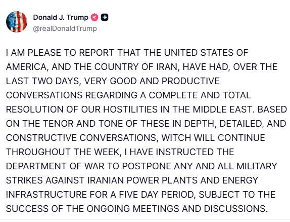 وكان أعلن الرئيس الأميركي دونالد ترامب، اليوم الاثنين، أنه أصدر تعليمات بتأجيل أي هجمات عسكرية تستهدف محطات الكهرباء والبنية التحتية الإيرانية لمدة خمسة أيام، وذلك قبل ساعات فقط من الموعد النهائي الذي كان من شأنه تصعيد الصراع الذي دخل أسبوعه الرابع.