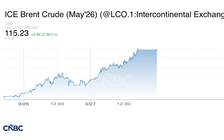 وارتفعت العقود الآجلة لخام برنت بأكثر من 50% منذ اندلاع الحرب وتجاوزت لفترة وجيزة 119 دولاراً للبرميل الأسبوع الماضي، بعد أن هاجمت إيران أهدافاً مرتبطة بقطاع الطاقة في أنحاء الشرق الأوسط وهددت السفن التي تحاول الإبحار عبر المضيق الذي كان يمر منه نحو خُمس إمدادات النفط والغاز العالمية.