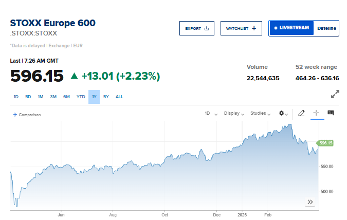 وصعد المؤشر الأوروبي الرئيسي «ستوكس 600» بنحو 2.2% إلى 596.15 نقطة، لكن المؤشر أنهى مارس بشباط على تراجع يُعد الأكبر منذ منتصف 2022، مع استمرار المخاطر الجيوسياسية والضغوط التضخمية على الأسواق.