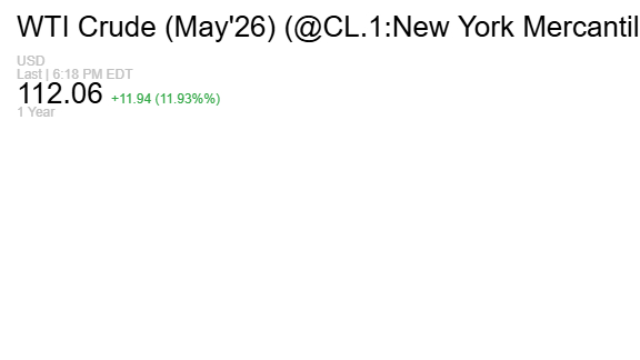 قفزت أسعار النفط الأميركية بأكثر من 10% لتتجاوز 112 دولارات للبرميل، فيما ارتفع خام برنت القياسي الدولي بأكثر من 6% ليصل إلى 109 دولارات.