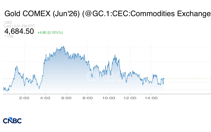 في المقابل، ارتفعت العقود الآجلة للذهب الأميركي بنسبة 0.1% لتبلغ عند التسوية 4684.70 دولاراً.