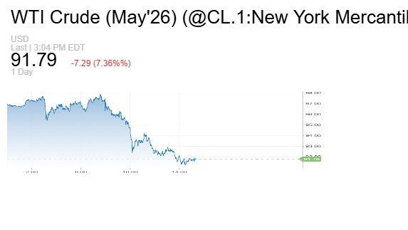انخفضت العقود الآجلة لخام برنت 4.57 دولار أو 4.6% لتبلغ عند التسوية 94.79 دولار للبرميل، كما تراجعت العقود الآجلة للخام الأميركي 7.80 دولار أو 7.87% لتبلغ عند التسوية 91.28 دولار للبرميل.