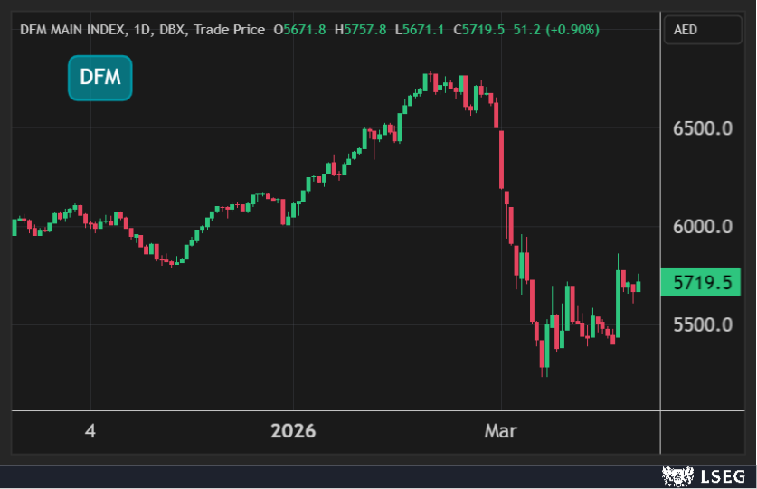 وفي سوق دبي، ارتفع المؤشر العام بنسبة 0.9% في جلسة الثلاثاء بدعم من ارتفاع سهمي سالك وإعمار العقارية بنسبة 3.3% و2.5% على التوالي.
