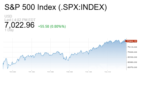 ارتفع مؤشر S&P 500 بنسبة 0.8% ليصل إلى 7022.95 نقطة