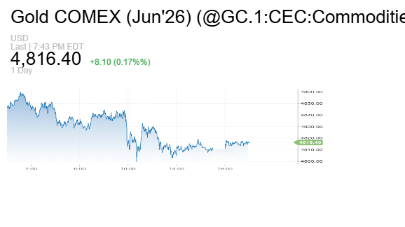 استقر سعر الذهب في المعاملات الفورية عند 4787.78 دولار للأونصة، بينما انخفض العقود الأميركية الآجلة للذهب بنسبة 0.3% إلى 4808.30 دولار عند التسوية.