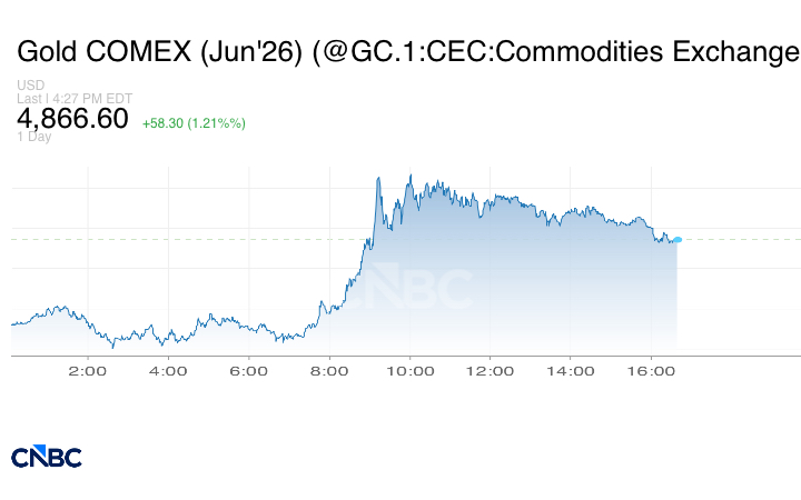 وزادت العقود الآجلة للمعدن الأصفر تسليم يونيو، عند التسوية، بنسبة 1.48% أو ما يعادل 71.30 دولار إلى 4879.60 دولار للأونصة، لترتفع بنسبة 1.92% على مدار الأسبوع.