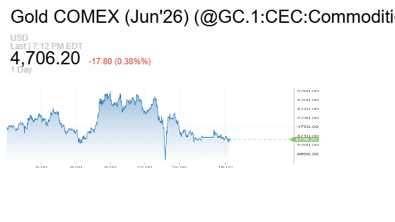 كما تراجعت العقود الأميركية الآجلة للذهب تسليم يونيو/ حزيران بنحو 0.6% إلى 4724 دولاراً عند التسوية.