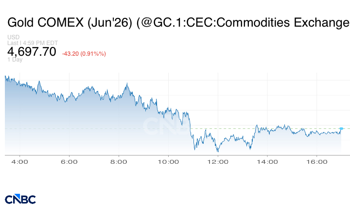 ونزل الذهب في المعاملات الفورية 0.2% إلى 4698.27 دولار للأونصة. كما انخفضت العقود الأميركية الآجلة للذهب تسليم يونيو/ حزيران 0.4% إلى 4697.60 دولار.