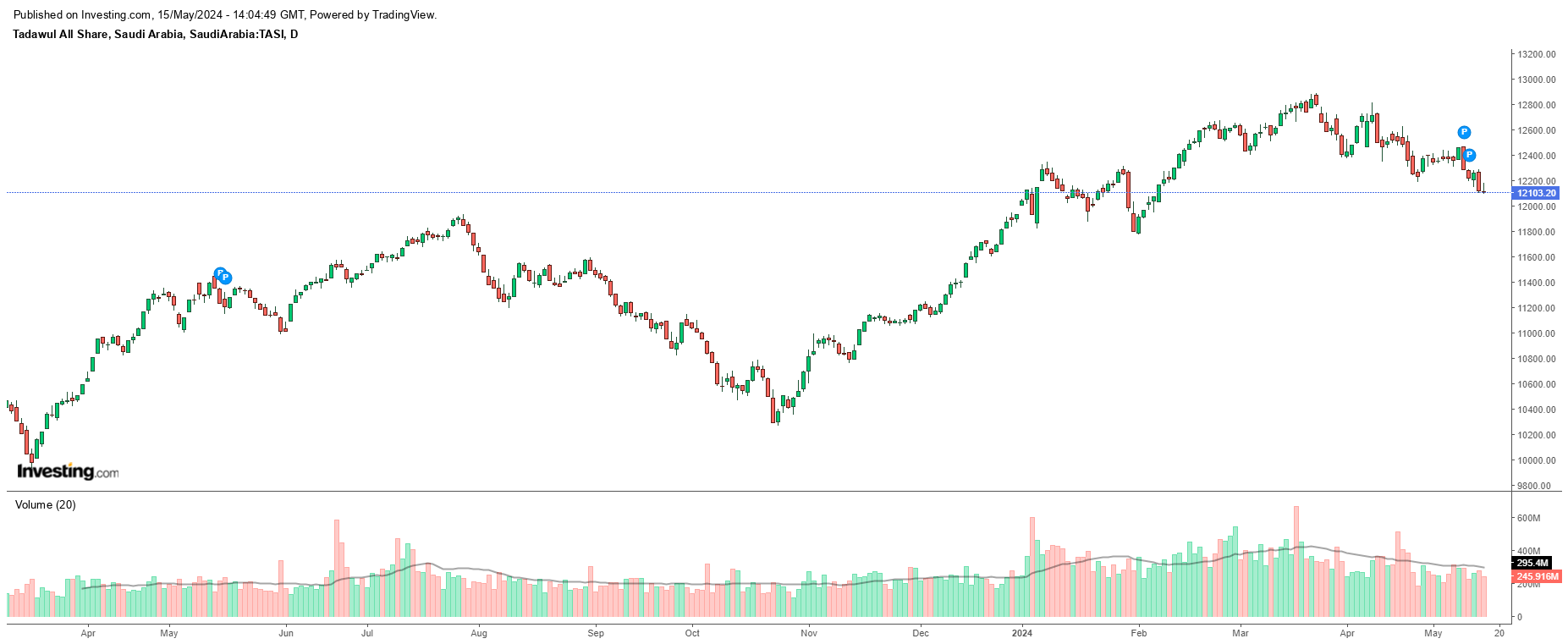 تراجع مؤشر تاسي السعودي للجلسة الثانية على التوالي، ليغلق عند مستويات 12103.2 نقطة، مستقراً عند أدنى مستوياته في 3 أشهر. وذلك وسط سيولة ضعيفة بلغت 6.3 مليار ريال وبأحجام تداول بلغت 247 مليون سهم.