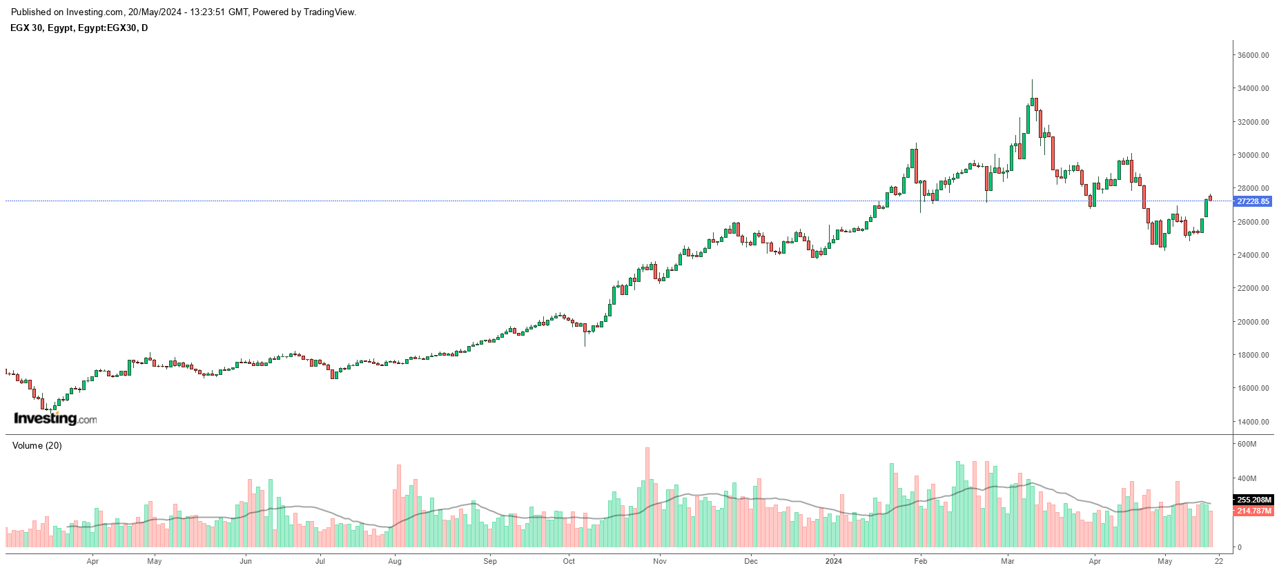 أنهت البورصة المصرية جلسة الإثنين على تباين؛ حيث أغلق الثلاثيني الرئيسي على تراجع بنسبة 0.32% عند مستوى 27228.85 نقطة.