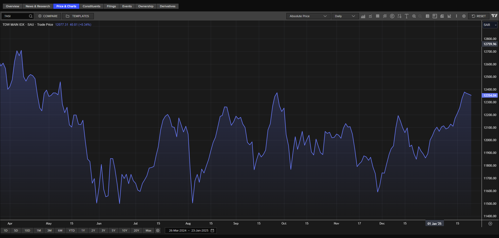 وواصل المؤشر السعودي، التراجع للجلسة الثالثة على التوالي، بضغط من قطاع البنوك، ليتراجع بنسبة 0.07% إلى 12345 نقطة، فيما سجل المؤشر ارتفاع للأسبوع الثاني على التوالي بأقل من 1%، مسجلاً أعلى إغلاق أسبوعي في نحو 4 أشهر.