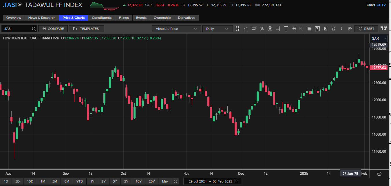 وواصل المؤشر السعودي الخسائر، للجلسة الثالثة على التوالي، بضغط من قطاع الطاقة، مسجلاً أكبر خسارة يومية في شهر، ليتراجع بنحو 0.3%، فاقداً مستوى 12400 نقطة، ويغلق عند مستوى 12377 نقطة.