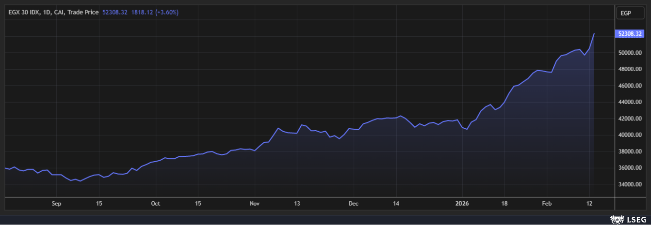 أغلقت المؤشرات المصرية أولى تداولات جلسة الأسبوع على مكاسب جماعية بدعم من 3 قطاعات وأغق الثلاثيني فوق 52300 نقطة لأول مرة في تاريخه ليسجل أكبر وتيرة مكاسب يومية منذ يونيو 2025 ويوسع من مكاسبه لأكثر من 25% منذ بداية 2026.